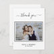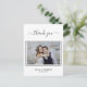Une carte postale Merci moderne et élégante, personnalisée avec votre propre photo. Ajoutez Votre photo, la date du mariage, vos noms et la note de remerciement. Une carte en noir et blanc tendance. Le texte : Merci sur l'avant et vos noms sur l'arrière sont écrits avec une écriture manuscrite stylisée.