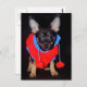 Portrait adorable photo d'un petit chiot portant un pull en laine rouge et bleue doux avec des poms de pom.