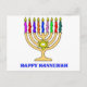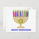 Une menorah Hannukah brillante avec les mots Happy Hannukah accueille la fête. Heureux latke manger!