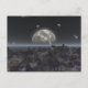 Illustration numérique d'une planète alien avec une lune au-dessus d'un océan et une douche météorologique.