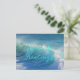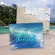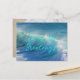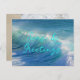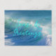 Carte postale des mers et des salutations pour la saison des fêtes. Image arrière - plan des vagues écrasantes avec grand script bleu aqua pour votre choix de salutation. Ajoutez un message et une signature à l'arrière sur une image de plage lisse.