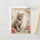 Un chaton tabby duveteux aux yeux bleus saisissants est assis à côté de deux roses roses sur un fond comportant des écritures vintage et des taches d'encre. Les tons sépia donnent une sensation chaude et antique à la composition, qui combine des fleurs et un sujet animal mignon.