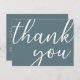 Un fond gris ardoise. Sur le devant, un grand lettrage manuscrit avec le texte : Merci. Dos : Modèle pour votre note de remerciement et nom/noms. Astuce : Si vous ne voulez pas que cela ressemble à une carte postale, cliquez sur personnaliser, allez au verso et supprimez le séparateur et le timbre-poste.