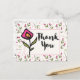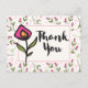 Une fête merci carte postale avec "Merci" et une jolie fleur rose à l'intérieur d'un cadre carré avec une bordure rose. L'arrière - plan est un motif avec des fleurs sauvages roses dessinés à la main avec de longues tiges vertes et des feuilles sur un arrière - plan blanc en coquille d'oeuf. Des cercles roses et des sprigs décorent également le design. Le dos porte votre nom personnel et un message de remerciement avec un motif de fleur peu fin derrière le texte. Design Whimsical et joli à fleurs.