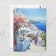 Une carte élégante avec les mots « Merci ! » et une vue pittoresque de Santorin. Des maisons d'un blanc de neige avec des dômes bleus, la mer et des fleurs de bougainvillée éclatantes créent une atmosphère de romance méditerranéenne et de confort. Parfait comme carte de remerciement après un mariage, des vacances ou un voyage, ainsi que comme souvenir exquis.