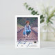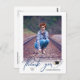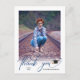 Cette simple graduation photo merci carte postale avec un script moderne bleu foncé "merci" qui apparaît sous la photo verticale. L'arrière offre un texte personnalisé pour un message de remerciement personnel.