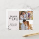 Cette typographie florale merci carte postale photo est parfaite pour un mariage élégant. Le design romantique présente un lettrage simple orné de fleurs, un bordement botanique et un arrière - plan subtil et blush. Personnalisez la carte avec 3 photos mariages, vos noms et votre adresse de retour (au verso).