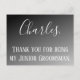 Votre jeune homme a fait un si bon travail à votre mariage. Montrez-lui l'amour et l'appréciation avec cette note de remerciement personnelle. Disposant de son nom écrit en lettres blanches et cursives sur un arrière - plan noir à l'ombre, en dessous est "Merci d'être mon Junior Groomsman" écrit en merveilleuse police blanche. Personnalisez votre carte postale merci aujourd'hui !