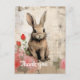 Un lapin brun est représenté au milieu d'un ensemble de fleurs vibrantes sur un fond beige texturé avec diverses marques abstraites et gouttes. La fourrure du lapin est rendue avec une attention aux détails, donnant une apparence douce et réaliste, tandis que les roses roses et rouges ajoutent une touche de couleur à la composition.