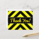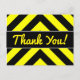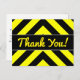 Cette conception de carte postale présente un motif en chevron noir et jaune. Elle comporte également le message "Merci !" sur le devant en texte jaune de type manuscrit, ainsi qu'un message de remerciement personnalisé au verso.