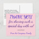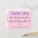 Ce design simple, simple et personnalisé de carte postale de remerciement mariage comprend le message "MERCI pour partager une journée si spéciale avec nous !" sur le devant, ainsi qu'un message personnalisable sur le dos. Il présente des couleurs comme le rose et le violet. Il pourrait être utilisé pour offrir de la gratitude à quelqu'un qui a été invité à une cérémonie de mariage.