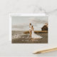 Elégant script de signature moderne "Merci" en blanc, photo mariage merci carte postale. L'arrière de la carte comporte un agencement fleur sauvage aquarelle et plusieurs lignes de texte modèle pour les noms, l'adresse et le message.