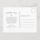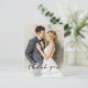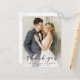 Merci à vos invités mariages dans le style avec cette photo personnalisée élégante merci carte postale. Ce modèle de design typographique présente votre image sur le devant avec une superposition et les mots "Merci" en script noir et vos noms et date mariage à personnaliser. Le dos de la carte postale a un message personnalisé et une signature sur un arrière - plan blanc. Conçu par l'artiste Susan Coffey.