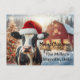 Merry Christmas on the farm with cow, lighted Christmas tree and red barn personalized Postcard