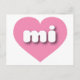 Cette carte postale présente un coeur rose cool contenant les lettres mi, coques inférieures arrondies et audacieuses, blanches, une abréviation amusante pour Michigan, l'État des Grands Lacs. Le verso de la carte postale est vide, en attendant votre texte customisé ou vos sentiments manuscrits.