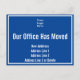 En haut, il y a une image d'affichage que vous pouvez remplacer par le logo de votre entreprise. Sous il y a le texte d'affichage d'un message personnalisé (illustré : Notre Bureau A Déménagé). En bas, il y a quatre lignes de texte pour la nouvelle adresse. La carte postale est bleu foncé. Le texte est blanc.