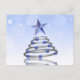 Illustration 3D Abstraite et moderne avec un arbre de Noël en chrome argenté orné de bleu et un dessus étoile sur un arrière - plan de livre bleu clair.