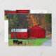 Les chevaux broutent devant la grange rouge vif. Les couleurs d'automne sont dans l'arrière - plan.