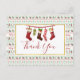 Invitation à une fête de Noël avec un motif répétitif en arrière-plan, dans le style d'un pull de Noël laid. Le motif est composé de chaussettes, de boules de Noël, d'étoiles et de flocons de neige. Avec le texte "Joyeux Noël" répété en rouge. Amusant et festif. Superposé est un rectangle blanc avec une bordure en faux doré, à l'intérieur se trouve une illustration de chaussettes suspendues à l'ancienne et le texte "Merci" écrit à l'intérieur. Message au verso que vous pouvez personnaliser.