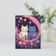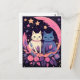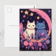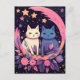Une charmante carte postale avec deux chats mystiques entourés de fleurs, d'étoiles et d'une lune de croissant, parfaite pour envoyer des images enchanteresses à vos proches.