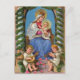 jolie peinture vintage à l'aquarelle avec madonna et son enfant. la madonna est assise sur un trône doré portant une longue robe bleue et rouge, un écharpe blanche à l'épaule aux étoiles dorées, une coiffure blanche, une couronne sur la tête, un halo doré, et elle tient le bébé jésus dans ses bras, qui a un halo doré rayonnant autour de sa tête. deux anges nourrissants sont assis devant et l'un joue de la mandoline, l'autre joue un petit trumolin les deux sont vêtus de roses blanches avec des parures d'or, aux pieds de la madonna et autour des anges sont des roses roses au sol, et deux colonnes classiques avec une flore verte qui les entoure et une arcade encadrant la madonna et l'enfant. peinture vintage chrétienne en rose et bleu.