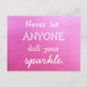 La citation inspirante "Ne laissez jamais personne ternir votre éclat" sur un arrière - plan de parties scintillant rose - une carte postale stimulante et motivante à envoyer à un ami ou à un proche.