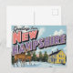 Discover the charm of the Granite State with this nostalgic "Greetings from New Hampshire" postcard. This vintage large-letter design features a serene winter scene with majestic deer (bucks), pine trees, and a classic New England yellow farmhouse. It perfectly captures the rustic beauty and wildlife of New Hampshire. Ideal for residents, visitors, winter sports fans, animal lovers, souvenir collectors, and anyone who enjoys US state travel art and classic Americana. Send a unique note or display this piece of retro nostalgia.