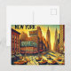Voici la carte postale de voyage vintage qui présente New York avec la Statue de la Liberté, une silhouette de skyline et une typographie audacieuse de style années 1950. 🗽 🌆 Les teintes du coucher de soleil et l'effet défraîchi et blanchi du soleil lui donnent une ambiance nostalgique et rétro.
