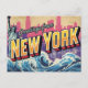 This uniquely stylized, retro-inspired design features the iconic "Greetings from NEW YORK" typography alongside the Statue of Liberty and the Manhattan skyline. The dramatic foreground is dominated by large, stylized ocean waves, giving the piece a distinct, almost Ukiyo-e inspired feel combined with classic American travel art. Perfect for fans of vintage posters, retro artwork, New York City landmarks, and bold artistic styles. This is an ideal souvenir or gift for anyone who loves the Empire State.
