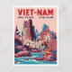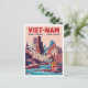 Escape to the stunning coastline of Vietnam with this dramatic vintage travel poster style postcard featuring Nha Trang and Cam Ranh. The design showcases a striking landscape of rugged, reddish-pink rock formations, vibrant palm trees, and clear blue waters, with a figure in traditional yellow and red attire. The bold, contrasting colors and graphic style give the scene a powerful, retro-exotic feel. This postcard is perfect for celebrating the beautiful beaches and unique geology of Southeast Asia, decorating with retro art, or sending a memorable greeting from this tropical destination.