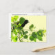 Cette carte postale présente un oiseau-noir à ailes rouges sur une branche vers le haut dans un peuplier. Il regarde derrière les feuilles verts dorés. Le ciel a une teinte jaune très pâle.