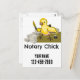 Faites la publicité de votre entreprise de notaire mobile ou d'agent de signature de prêt avec une touche d'humour. Les éléments de design fantaisistes présentent un poussin jaune mignon entouré de piles de documents et d'une bouteille d'encre noire jet. Elle tient une plume jaune délicate, au-dessus du slogan "Notary Chick". La carte postale personnalisée fait un excellent cadeau pour tout professionnel notaire qui fournit un service précieux au public. Ce design de poulet notaire convient aux fonds blancs et de couleur claire. Personnalisez en remplaçant "Votre nom" par un nom, un lieu ou tout autre texte de votre choix. La deuxième ligne peut être personnalisée avec un numéro de téléphone, un nom de société, une adresse web ou tout autre texte. Conseil de conception : pour les noms longs, vous devrez peut-être réduire la taille du texte.