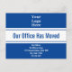 En haut, il y a une image d'affichage que vous pouvez remplacer par le logo de votre entreprise. Au centre, il y a un texte d'affichage bleu profond pour un message personnalisé (illustré : Notre bureau a déménagé). En bas, il y a des lignes de texte d'affichage que vous pouvez modifier pour partager la nouvelle adresse. La carte postale est bleue et blanche.