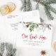Annoncez votre nouvelle maison de vacances à votre famille et à vos amis avec ce design moderne de script de vacances et de feuillage de Noël.