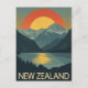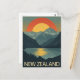 Cette carte saisissante présente une illustration de style vintage d'un paysage néo-zélandais pittoresque. Le design met en valeur de majestueuses montagnes et un lac serein reflétant la lueur chaude d'un grand soleil couchant. Il capture la beauté naturelle célèbre du pays avec une esthétique classique et rétro. La typographie audacieuse "NOUVELLE-ZÉLANDE" complète l'aspect, ce qui en fait un souvenir ou un message parfait pour tout amoureux de la nature ou voyageur.