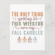 Ce design d'automne humoristique et cosy comprend la phrase spirituelle "La seule chose qui s'illumine ce week-end sont mes bougies d'automne" dans un mélange de polices audacieuses et élégantes. Le texte est aménagé de façon créative avec des tailles et des styles de police différents, ajoutant un intérêt visuel et un ton ludique. La palette de couleurs comprend des teintes chaudes d'automne comme l'orange brûlé, les verts terreux et les marron doux, qui évoquent la chaleur et le confort de la saison.