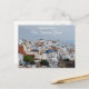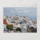 Carte postale de Santorin, Grèce montrant la ville d'Oia. Cette image photographique capture la perche de la ville sur le côté de l'île avec la mer derrière. Santorin est l'une des îles grecques les plus populaires et après avoir visité, il n'est pas difficile de comprendre pourquoi. Il y a deux villes idylliques de la capitale Fira, avec sa célèbre église avec trois cloches, bien que j'ai remarqué que beaucoup des églises de Santorin ont trois cloches, et la ville d'Oia où les gens se rassemblent pour voir le spectaculaire coucher de soleil tous les jours. Ils ont tous deux beaucoup de bâtiments blanchis à la chaux et des rues étroites ainsi que des églises à dôme bleu. Santorin est une île grecque très appréciée pour les couples qui veulent se marier au soleil. Si vous souhaitez une plage, vous devrez vous éloigner de Fira et d'Oia, aussi jolies soient-elles, elles n'ont pas de plages. Carte postale Santorin, Grèce