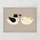 Une carte très mignonne avec une mariée canari-oiseau et mariée en tenue de mariage vintage traditionnelle - avec un coeur rouge entre eux, placée contre un arrière - plan rayé de couleur sépia.