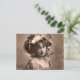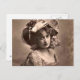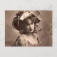 Photo vintage amusante d'une jeune femme portant une robe et un casquette en dentelle et avec un oiseau blanc sur le devant du casquette