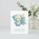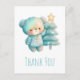 Carte de remerciement avec une illustration adorable. Un ours douillet avec des étoiles et des étincelles dans sa fourrure. Debout à côté d'un arbre de Noël. Couleur bleu-vert pastel. Fantaisiste et mignon.