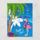 Ce carte de remerciements de vacances d'hiver est orné de palmiers ornés de lumières de Noël et d'un flamand de flamand vêtu d'un chapeau de Père Noël dressé contre un arrière - plan de plage abstrait bleu et blanc cool. Quelques graphiques par artwork&@delightful-doodles.com