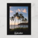 Carte postale avec palmiers sur une plage au coucher du soleil sur une île d'Hawaii avec une bordure noire et le texte : 'Hawaï'.