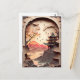Une belle carte postale à thème brun avec décor découpé en papier représentant l'ancienne construction chinoise, les arbres, les montagnes et le lac.