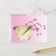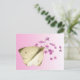 Cette carte postale présente l'exquis papillon de chou (Pieris rapae). Elle a arrêté de flâner dans le jardin assez longtemps pour se percher sur une verveine en fleurs. Elle a un corps noir qui ne montre pas sous ses quatre ailes blanches, chacune avec un point noir au centre. Les deux ailes supérieures ont une bande noire au bout. Son visage est vert pâle. Bien qu'elle soit une créature charmante et délicate, ses chenilles dévorent les choux et d'autres membres de la famille des légumes brassica. L'inverse a un petit papillon sur un arrière - plan de dégradé rose pâle.