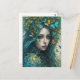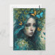 Une femme aux cheveux bleus flottants est entourée de papillons et de feuilles, créant une atmosphère mystique et éthérée. Son expression sereine et ses couleurs vives transmettent un sentiment d'harmonie avec la nature.