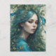 Une femme aux cheveux turquoise flottants est entourée de papillons bleus vibrants, créant une scène éthérée et onirique. Son expression sereine complète la beauté naturelle et le mouvement des feuilles entrelacés avec ses cheveux.