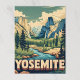 Une affiche de voyage de style rétro illustre la superbe vallée de Yosemite, avec ses hautes falaises de granit comme El Capitan et Half Dome, une rivière sinueuse, et ses forêts luxuriantes de pins sous un ciel spectaculaire. "YOSEMITE" est affiché en bas.