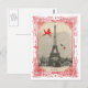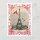 Une douce cuppée rouge vole autour de la Tour Eiffel à partir d'une carte postale française antique envoyant ses flèches d'amour à tous les Parisiens et visiteurs à Paris en contrebas, entourés d'une image vintage et soignée.