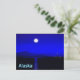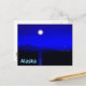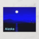 Lever de lune dans le passage intérieur du manteau de l'Alaska. Montagnes au loin et un bateau de pêche se dirige vers le nord. Le texte "Alaska" apparaît également en bleu et blanc brillant.