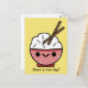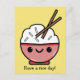 Carte postale mignonne avec un adorable bol rose de riz blanc. Le bol a un joyeux visage de kawaii et le riz a deux baguettes qui stockent la rivière. Ci-dessous, une pièce de théâtre sur des mots disant "Ayez du riz !" en texte noir.